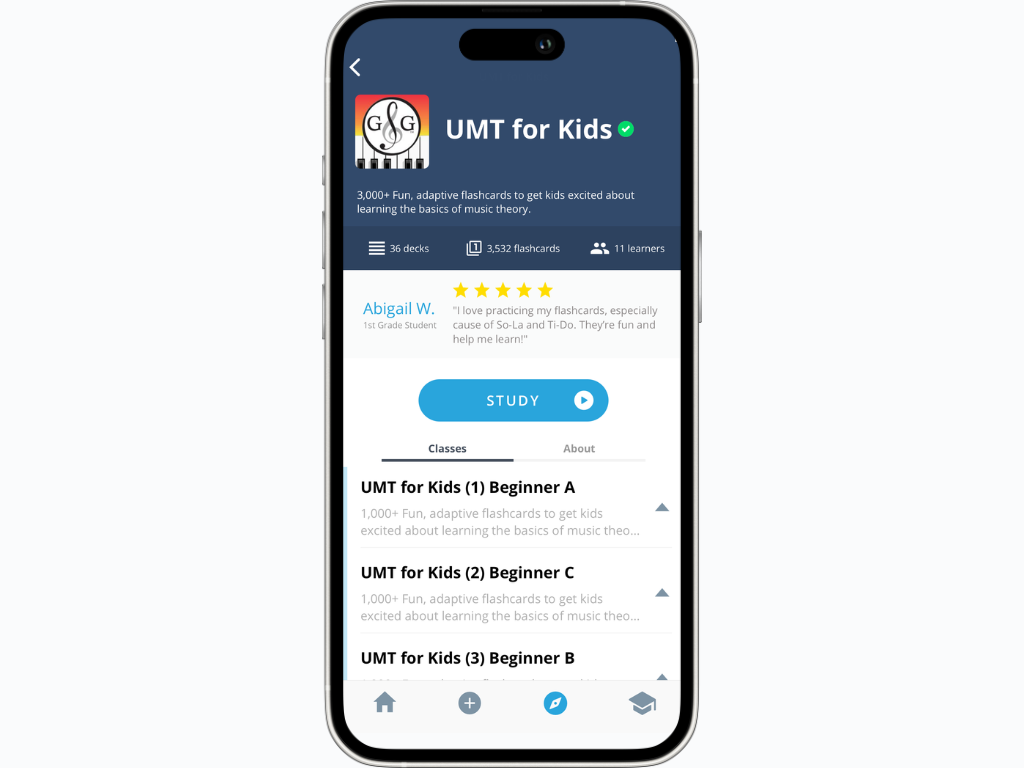 Brainscape is just one such app for music theory. What music teachers like about this flashcard app is that it breaks down the recommended music theory curriculum for young kids into a neatly organized collection of smart, adaptive flashcards that starts with UMT for Kids, Beginner A, progresses to Beginner B, and culminates in Beginner C. (Thereafter, you can work through UMT's Prep 1 flashcards, followed by Music Theory for older kids and adults.)