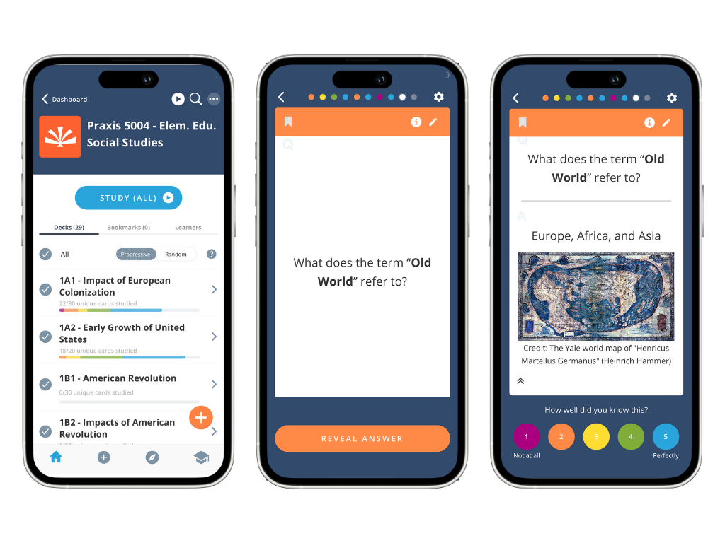 Even better, we’ve broken down the entire Elementary Education: Social Studies (5004) curriculum into this collection of 600 flashcards. These cover all of the highest-yield concepts you need to know, with all the fluff left out. They’ve also been neatly-organized into decks that align with Praxis’s 5004 test outline, with study metrics provided every step of the way so you always have a finger on the pulse of your progress.